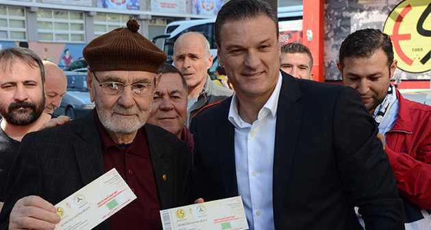 Eskişehirspor'un TFF 1. Lig'in 7. haftasında seyircisiz oynayacağı maça taraftar desteği sürüyor. Şehrin farklı noktalarında açılan stantlarda, seyircisiz maç için bastırılan hatıra biletleri satılıyor. Bilet satışının yapıldığı stantlarda renkli anlar da yaşanıyor. Atatürk Stadyumu önündeki standı ziyarete gelen Eskişehirspor Teknik Direktörü Alpay Özalan, 90 yaşındaki Yaşar Saylak ile karşılaştı. Bilet almaya gelen yaşlı taraftara, bir bilet de Eskişehirspor'un Mali Asbaşkanı Ekrem Birsen tarafından hediye edildi. Eskişehirspor'un kurulduğu günden itibaren kırmızı-siyahlı renklere gönül verdiğini aktaran Saylak, takımın eski günlerine döneceğini söyledi.