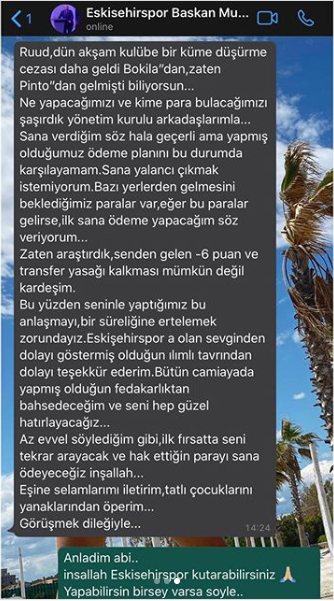 "3 yıla taksitlendirerek anlaştık. Kulübün prosedürleri geç uygulamasından kaynaklanan hatadan ötürü anlaşmayı iptal etmek isteyen taraf kulüp idi. Kulübün bu işlemi 2 ay önce tamamlaması gerektiğini ve geç kaldıklarını söylediler ve bunun neticesinde her şeyi iptal etmek zorunda kaldık." Şimdi bu yönetimin işini iyi niyetle yaptığını kim söyleyebilir, bile bile Eskişehirsporu küme düşürüyorlar ve de devam ediyorlar şimdi gel de misyonları amaçları zaten buymuş deme, rahatlıkla ligte kalabilecek belkide ilk 6 yı zorlayabilecek kadroyu alel acele geldikleri gibi dağıtıp yaptıkları icraat ortada ve bunlar Eskişehirsporluymuş muş muş. Ha la da istifa etmiyorlar tabutu tamamen gömene kadar orayı işgal etmeye kararlılar demek ki.