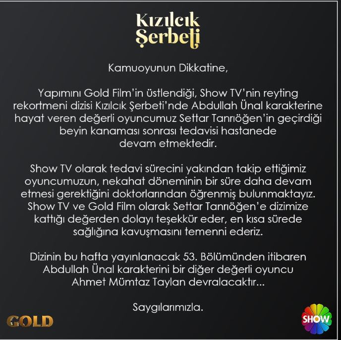 Sevilen Türk dizisi "Kızılcık Şerbeti", oyuncu Settar Tanrıöğen'in talihsiz sağlık durumu nedeniyle kadro değişikliğine gidiyor. Dizide "Abdullah Ünal" karakterini canlandıran Tanrıöğen beyin kanaması geçirdi ve acil ameliyata alındı. Şu anda tedavi görmekte olan Tanrıöğen, dizideki rolüne devam edemeyecek.Peki yerine hangi oyuncu gelecek?