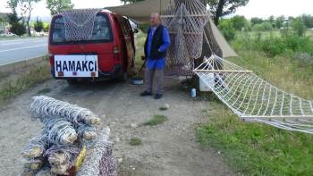 61 Yaşındaki Ahmet Kaplan, Tatilcilerin Vazgeçilmezi Olan Hamakçılık Mesleğine 21 Yıl Önce Kütahya-Eskişehir Karayolu Üzerinde Araç İçerisinde Başladığını Dile Getirdi.