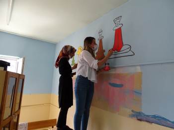 Kütahya’nın Hisarcık ilçesi Kutluhallar köyü İlk ve Ortaokulu öğretmenleri oluşturdukları Zeka Oyunları ve Okuma Atölyesinin boya ve resim çalışmalarını kendileri yapıyor.