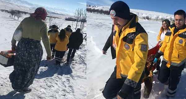 Afyonkarahisar’da kardan yolu kapanan köye giden 112 ekibi, mahsur kalan hastayı 2 kilometre sedyeyle ambulansa taşıyarak hastaneye ulaştırdı.