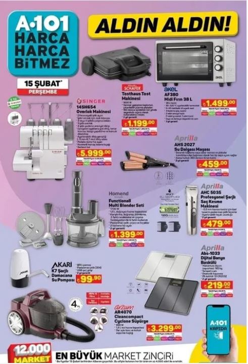 15 Şubat Perşembe A101 Kataloğu Fırsatları- Overlok Makinesi, Saç Maşası, Blender Seti...