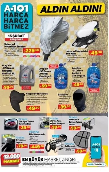 Ancak hepsi bu kadar değil - A101 ayrıca mobilya takımları, buzdolapları, giysiler ve mutfak elektroniğinde de indirimler sunuyor. Yani ister evinizi yenilemek ister gardırobunuza çeki düzen vermek istiyor olun, A101'de her şey var. Bu rakipsiz fırsatları kaçırmayın - A101 kataloğuna hemen göz atın ve 15 Şubat için alışveriş çılgınlığınızı planlamaya başlayın!