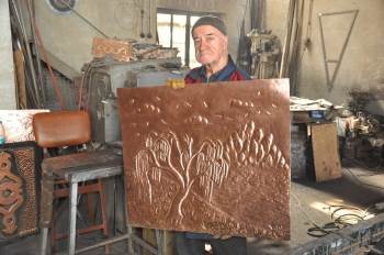 Afyonkarahisar’da uzun senelerdir demir doğrama ve bakır süslemeciliği yapan 75 yaşındaki Yakup Çetinkaya, hem koleksiyonları hem müzeye çevirdiği iş yeri hem de bakır dövme sanatıyla dikkat çekiyor. Çetinkaya 20 bin çekiç vurarak yaptığı manzara resmine gözü gibi bakıyor.