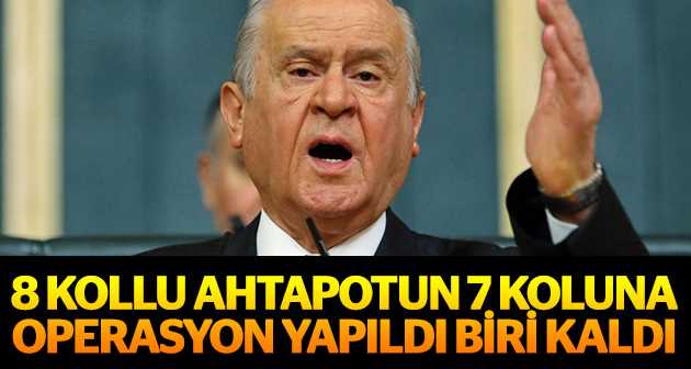 Bahçeli, FETÖ’yü “8 kollu ahtapota” benzetti ve ahtapotun siyaset ayağına da operasyon istedi. Bahçeli 8 ayaklı ahtapotu “TSK, yargı, emniyet, kamu kurum ve kuruluşları, basın ve yayın organları ile sosyal medya, üniversiteler ve eğitim kurumları, iş dünyası, siyaset kurumu ve siyasi partiler” olarak tanımladı. Bahçeli “15 Temmuz sonrası FETÖ’nün 8 ayağından 7’sinde devlet kendini korumak için tedbirler almaya başlamıştır ancak 8’inci ayak açıkta kalmış FETÖ’nün ve 15 Temmuz’un siyasi ayakları hâlâ açıklığa kavuşturulamamıştır” dedi.