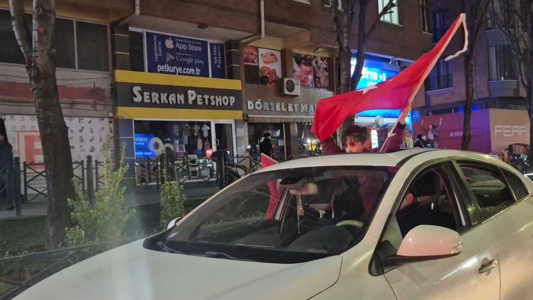 Yılmaz Büyükerşen Bulvarı üzerindeki bir alışveriş merkezi önünde toplanan vatandaşlar, bayraklar ve tezahüratlar eşliğinde kutlama yaptı. Araçlarıyla caddeden geçen sürücüler de kornalar çalarak ve araçlarından sarkarak coşkuya ortak oldu.