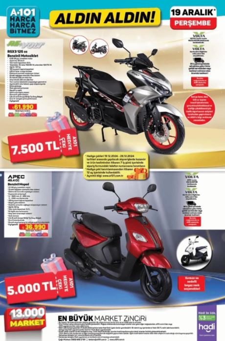 Bu ürünler, günlük hayatı kolaylaştıran ve konforunu artıran nitelikli ve yenilikçi ürünler olarak öne çıkıyor. Özellikle benzinli motosikletin A101 mağazalarında satışa sunulması, müşterilerin ulaşım ihtiyaçlarını karşılamada yeni bir fırsat sunuyor. Market, aralık ayı boyunca devam eden indirim kampanyaları kapsamında, 19 Aralık Perşembe gününde de onlarca üründe cazip fiyatlar sunuyor. Bu indirimlerin, müşterilerin alışveriş deneyimini daha da keyifli hale getireceği ve bütçelerine katkı sağlayacağı öngörülüyor.