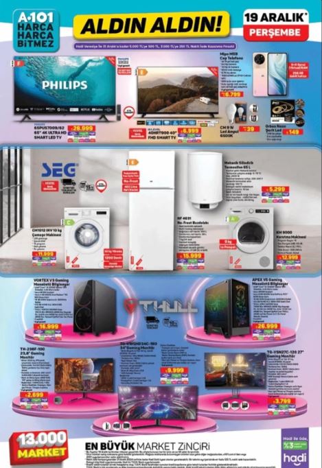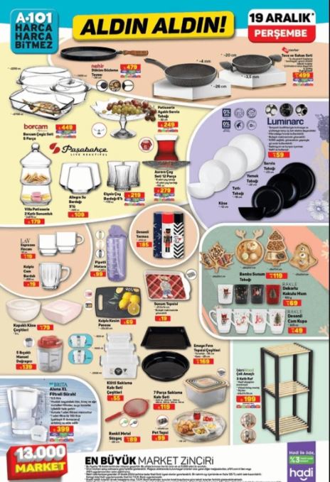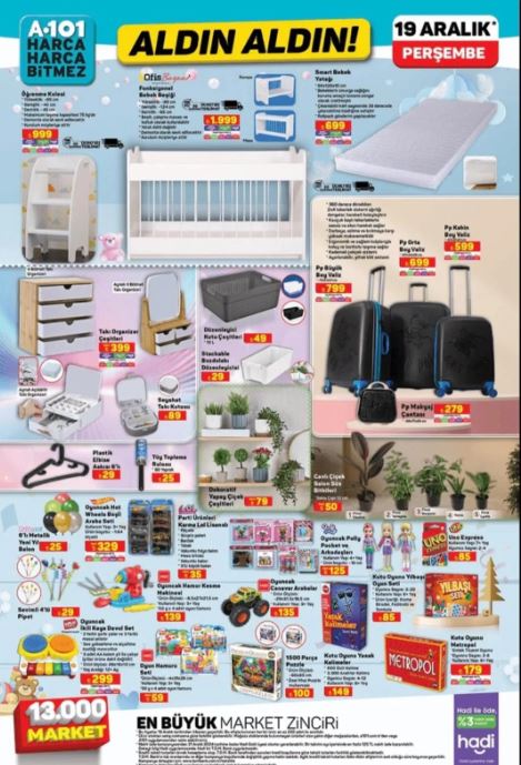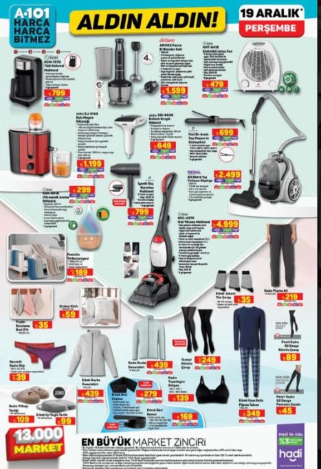 A101 market, müşterilerinin beklentilerini karşılamak ve onları memnun etmek için sürekli olarak güncel ve cazip ürün yelpazesini genişletmeye devam ediyor. 19 Aralık 2024 Perşembe günü yayınlanan aktüel ürünler kataloğunda dikkat çeken bazı ürünler arasında halı yıkama makinesi, buharlı ütü, kahve makinesi, masaüstü bilgisayar, motosiklet, bebek beşiği ve bavul seti bulunuyor.