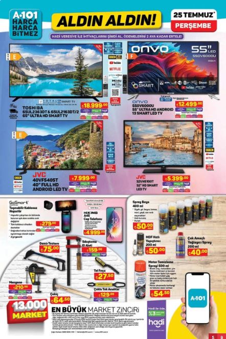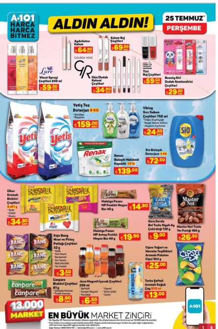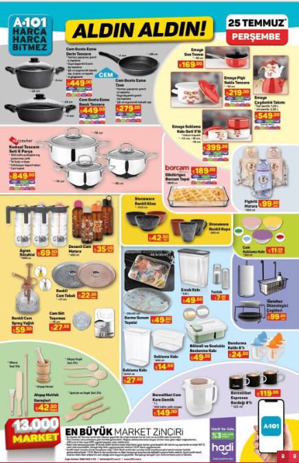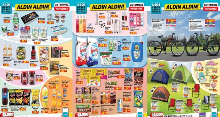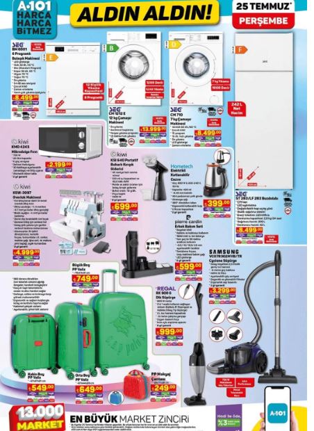 Örneğin, Samsung marka televizyonlar, Regal buzdolapları, Borcam pişirme gereçleri, Sütaş süt ürünleri ve Pınar et ürünleri A101'de bu hafta indirimli olarak satılacak. Tüketicilerin beklentilerini karşılayacak nitelikli ürünlere uygun fiyatlarla ulaşma imkanı bulmaları, A101'in müşteri dostu yaklaşımını yansıtıyor.İndirimli ürünleri yakından incelemek ve fırsatları kaçırmamak isteyen müşteriler, 25 Temmuz'dan itibaren A101 mağazalarını ziyaret edebilirler. Böylece hem bütçelerine, hem de ihtiyaçlarına uygun alışveriş yapma şansı yakalayabilirler.