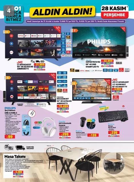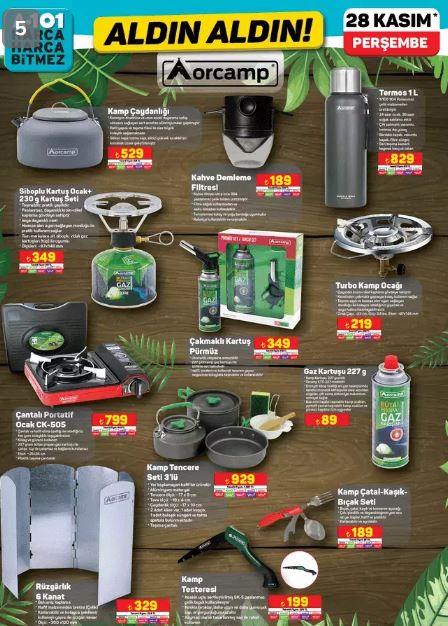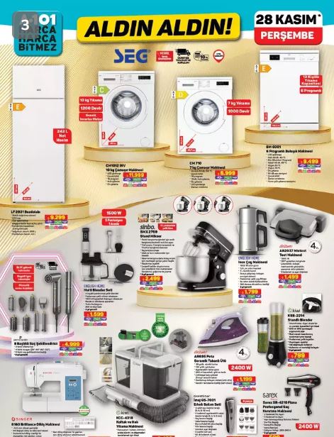 A101 'in bu haftaki indirimli kataloğunda dikkat çeken diğer ürünler; Kiwi koltuk ve halı yıkama makinesi, Singer dikiş makinesi, English Home multi blender seti, Pierre Cardin saç şekillendirici, Orcamp kamp çaydanlığı, Turbo kamp ocağı ve kamp tencere seti yer alıyor.  Bu ürünlerin tamamı 28 Kasım Perşembe günü A101 mağazalarında satışa sunulacak. İşte 28 Kasım A101 Aldın Aldın kataloğunda yer alan tüm indirimli ürünlerin kapsamlı listesi.