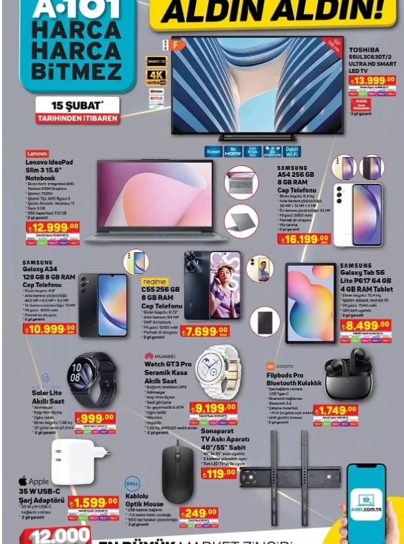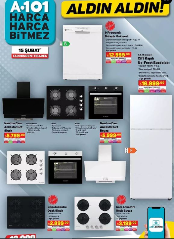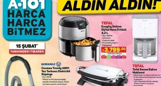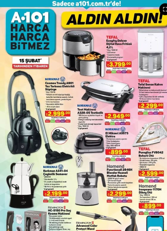15 Şubat'ta A101 Aldın Aldın kataloğunda Newton ankastre set,Samsung Çift Kapılı buzdolabı, Toshiba Led TV, Samsung Cep Telefonlarını çok uygun fiyata satın alabilirsiniz.   Sadece a101.com.tr'de online olarak sunulan bu inanılmaz fırsatlardan bazıları ise; Tefal ütü, Kokrmaz elektrikli süpürge ve tost makinesi ile Korkmaz Çaykolik, el mikseri ve Tefal easyfry,Tefal kahve makinesi...