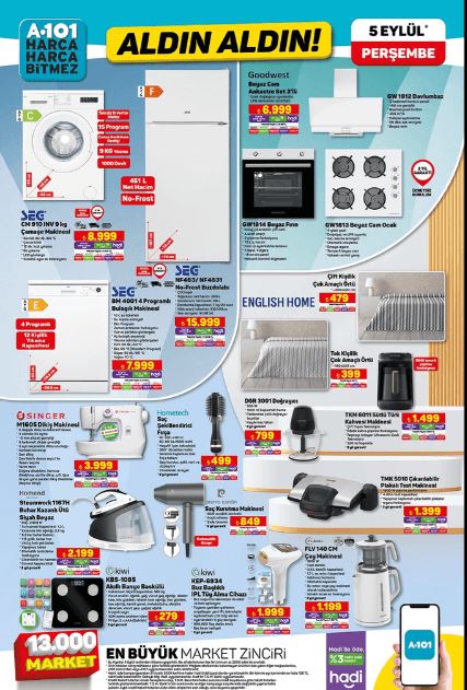 A101 televizyon, bisiklet ve valiz gibi üstün kaliteli ürünler, evlerinizi ve yaşam alanlarınızı yenileyebilmeniz için mükemmel seçenekler sunuyor. Bunun yanı sıra, şık ve kullanışlı dikiş makinesi, kahve makinesi ve tost makinesi gibi ürünler de oldukça cazip. Banyonuzun konforunu Kiwi banyo baskülüyle, yemek sunumlarınızı Paşabahçe borcamlarıyla artırabilirsiniz. Mutfağınız için Goodwest ankastre set ve Taç Bella döküm tencereler gibi modern ürünler de yer alıyor. Son olarak, Kütahya Porselen'in tekli ürünleri de sofralarınıza zarafet katacak.