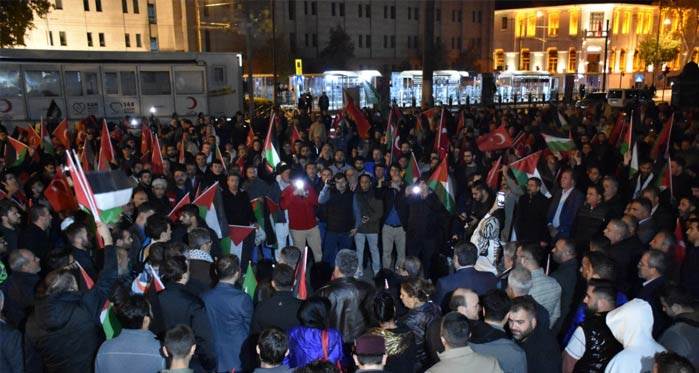 İsrail'in Gazze'deki el-Ehli Baptist Hastanesi'ne yönelik saldırısı Eskişehir'de vatandaşlar tarafından protesto edildi.