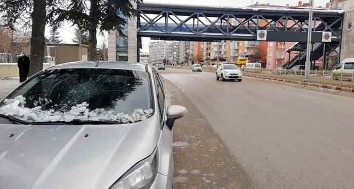Afyon haberi: Afyonkarahisar’da yolda ilerleyen otomobilin üstüne üst geçitten buz kütlesi düştü. Belediye temizlik ekiplerinin üst geçitteki kar birikintilerini temizlememesi yüzünden gerçekleştiği öne sürülen olayda otomobildeki iki kişi ölümden döndü.