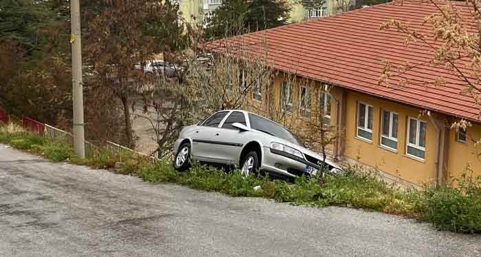 Afyonkarahisar’da yokuş yukarı çıkmak isteyen sürücünün otomobili kaydırması sonucu kontrolden çıkan araç yaklaşık 10 metre yükseklikteki şarampolden okulun bahçesine yuvarlanmak üzereyken son anda durabildi. Kaza sonrası ortaya çıkan görüntü ise adeta fizik kurallarını sorgulattı