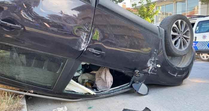Afyonkarahisar’da kontrolden çıkarak park halindeki araca çarptıktan sonra takla atan otomobil sürücüsü kazayı şans eseri yara almadan atlattı
