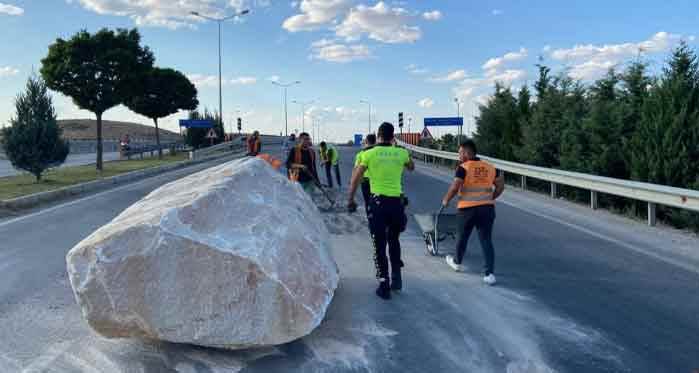 Afyonkarahisar’da tırın dorsesinden karayoluna tonlarca ağırlığında mermer blok düştü. Olay esnasında karayolun boş olması ise olası facianın önüne geçti.