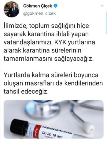 Çiçek, Twitter hesabından yaptığı açıklamada, Korona Virüs tedbirleri kapsamında evlerinde karantinaya uymayanları uyararak, "İlimizde, toplum sağlığını hiçe sayarak karantina ihlali yapan vatandaşlarımızı, KYK yurtlarına alarak karantina sürelerinin tamamlanmasını sağlayacağız.