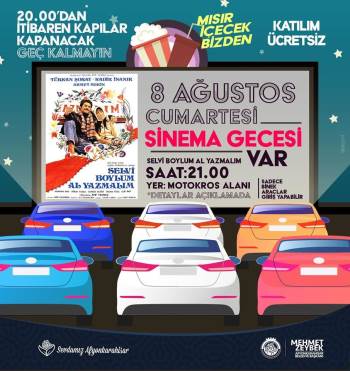 8 Ağustos Cumartesi günü saat 21:00’de Motokros Alanında düzenlenecek ücretsiz etkinlikte, sinemaseverler Yeşilçam’ın unutulmaz klasikleri arasında yer alan “Selvi Boylum Al Yazmalım” adlı filmi izleyecek. Sosyal mesafe sınırları içerisinde gerçekleşecek etkinlikte filmin sesi kapalı devre radyo sistemiyle dinlenebilecek. Ekinlikte vatandaşlara patlamış mısır ve içecek ikramında da bulunulacak.