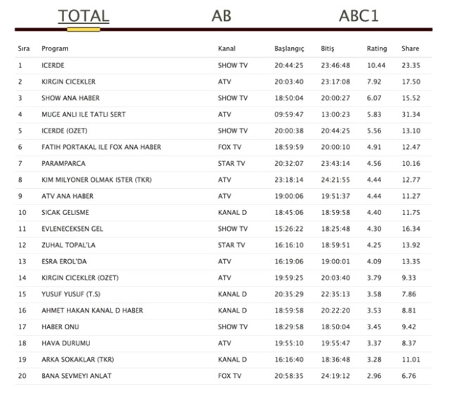Ahmet Hakan'ın sunduğu Kanal D Ana Haber 16. sırada yer aldı.