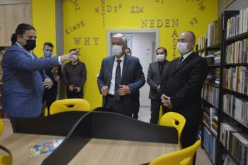 Okul kütüphanesi açılışı sonrası okul içerisindeki sınıfları dolaşan Kaymakam Kanyılmaz daha sonra okul müdürü M. Kemal Pişkiner tarafından kütüphane ve okul hakkında bilgiler aktarıldı.