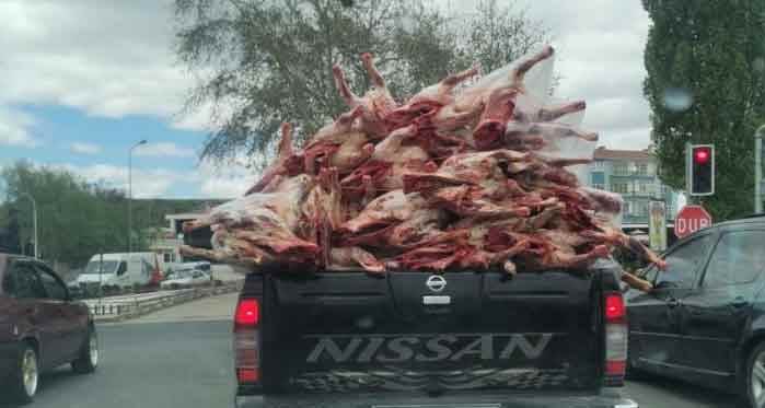 Ankara'nın Polatlı ilçesinde trafikte kasasında hiç bir önlem almadan kilolarca et taşıyan bir kamyonet görenleri şok etti.