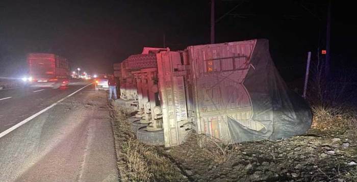 Alkollü tır sürücüsü kaza yaptı: Yol kenarına devrildi!