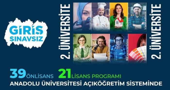 Sınavsız ikinci üniversite ile öğrencilere 39 ön lisans ve 21 lisans programında okuma fırsatı sunuluyor. Öğrenciler 30.000 üzerinde ders malzemesine ücretsiz erişim olanağına sahip oluyor. 81 ilde 110 sınav merkezi ve öğrencilik işlemleri için büro desteği de Anadolu Üniversitesinin öğrencilere sunduğu imkanlar arasında yer alıyor.
