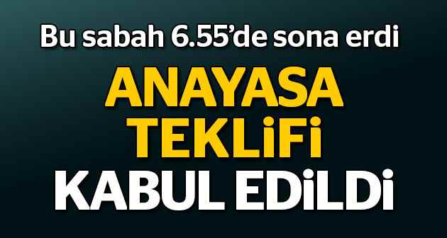 Ak Parti'nin anayasa teklifinin son maddesi komisyonda kabul edildi. Anayasa Komisyonu dün saat 14.30 da başladığı mesaisini aralıksız sürdürdü. Yapılan oylama sonucu teklifin tümü komisyondan geçti .06,55 itibariyle teklif komisyonda kabul edildi