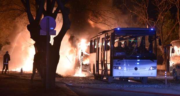 Ankara'nın bir çok yerinde duyulan patlamanın ardından iki askeri servis aracı bir anda alev topuna döndü. Yükselen simsiyah dumanlar Ankara'nın her tarafından görülürken olay yerine çok sayıda ambulans ve itfaiye ekipleri sevk edildi.