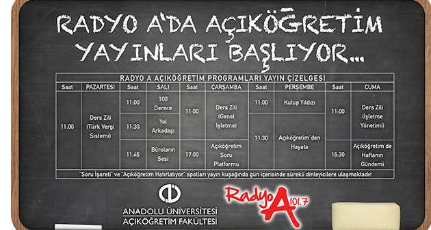 1998 yılından bu yana yayın hayatında olan Anadolu Üniversitesi radyosu Radyo A’da yayınlanacak Açıköğretim programları, 101.7 Frekansı ve www.radyoa.anadolu.edu.tr adresinden dinlenebilir. Açıköğretimin web sayfası ve Anadolu mobil uygulamasından da yayın linklerine ulaşılabilecek. Ayrıca Açıköğretim yayınlarının tekrarını Radyo A’nın web sayfasında yer alan Arşiv bölümü ve ANADOLUM eKampüs sisteminden de dinleme şansı bulunuyor. Yayın akışları ve programlarla ile ilgili bilgiler, twitter.com/radyo_a ve facebook.com/RadyoA hesapları ile Açıköğretimin sosyal medya hesaplarından takip edilebilir.