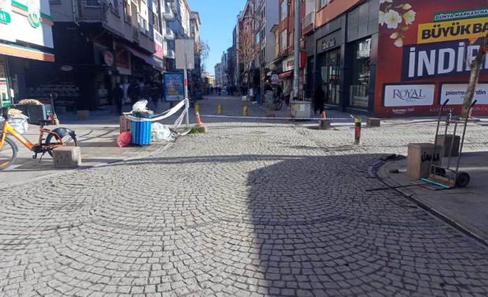 Cadde üzerindeki bazı esnaf ve yaya güzergâhlarında geçici yönlendirmeler uygulanırken, yol yüzeyinde kazı ve düzenleme izleri dikkat çekiyor. Çalışmanın ne kadar süreceğine dair bilgilendirici tabela bulunmazken, günlük cadde trafiği çalışmalar eşliğinde devam ediyor.