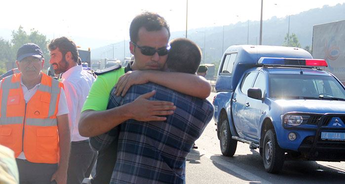 Kazadan yara almadan kurtulan asker Kazım Kılıç, dedesinin yaşamını yitirdiğini görünce şoka girdi. Dakikalarca gözyaşı döken ve bir yandan da ailesini sakinleştirmeye çalışan Kılıç’ı, kaza yerinde bulunan trafik polisi sarılarak teselli etti.