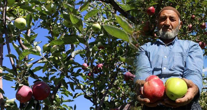 Van’ın Edremit ilçesinde çiftçilik yapan Hasan Yurtbay, 10 yıl önce diktiği elma ağacında hem yeşil hem kırmızı elma yetiştirdi.