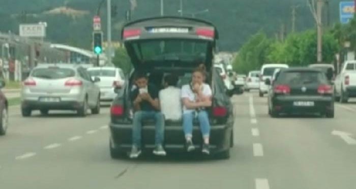 Bursa'nın Nilüfer ilçesine bağlı Beşevler caddesinde meydana gelen olayda, otomobilin bagajında trafikte seyir halinde giden üç genç ve otomobil sürücüsü diğer araçları trafikte tehlikeye attı. Diğer sürücülerin tepkisine neden olan olayda, sürücüler otomobilin arkasında hiç bir güvenceleri olmadan yolculuk yapan üç genci ve otomobili telefon kamerasına kaydetti.