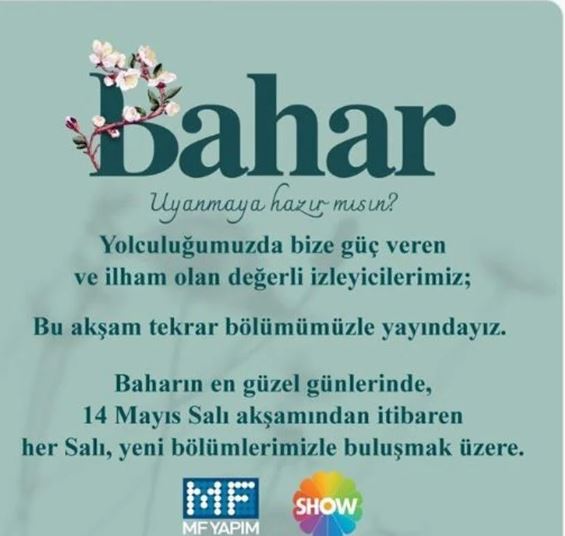 Demet Evgar, Buğra Gülsoy ve Mehmet Yılmaz Ak'ın başrollerini paylaştığı Bahar dizisi, ekran macerasına ara verdi. Dizinin yeni bölüm fragmanı yayınlanmadığı için hayranları, yeni bölümün yayınlanıp yayınlanmayacağı hakkında bilgi sahibi olamamıştı. 7 Mayıs tarihli yayın akışına göre, Bahar dizisinin tekrar bölümü ekranda yer alacaktı. Fakat, dizinin çekimleri yetişmediği için yeni bölüm bu hafta yayınlanamayacaktı. Birsen Altuntaş'ın haberine göre, Bahar dizisinin bu akşam yayınlanacak olan yeni bölümü yetişmediği için tekrar bölümü seyirciyle buluşacaktı. Bu durumda, Bahar dizisinin hayranları yeni bölümü beklemek zorunda kalacaklardı. Ancak, yapım şirketi MF Yapım konuyla ilgili bir açıklama yaparak hayranlarına müjde verdi. Açıklamada, "Baharın en güzel günlerinde, 14 Mayıs Salı akşamından itibaren her salı, yeni bölümlerimizle buluşmak üzere" ifadeleri kullanıldı. Bu haber, dizinin hayranları arasında büyük bir sevinç yarattı.