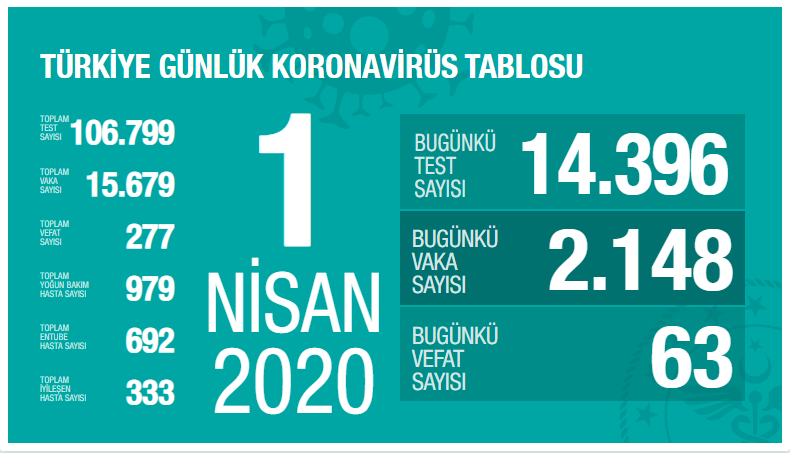 Son 24 saatte 2148 kişiye Kovid-19 tanısı konuldu, 63 kişi hayatını kaybetti, vaka sayısı 15 bin 679'a, can kaybı 277'ye ulaştı. Kovid-19 tedavisi tamamlanarak taburcu edilen toplam kişi sayısı 333 oldu.
