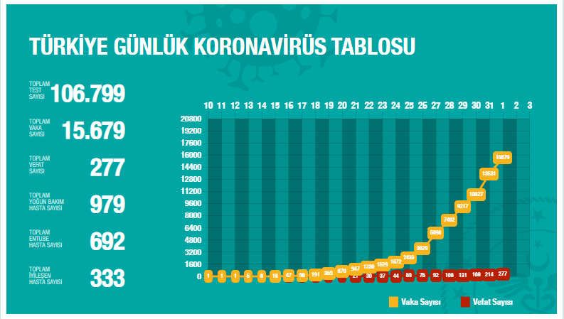 Buna göre toplam vaka sayısı 15.679 oldu ve hayatını kaybedenlerin sayısı 277'ye yükseldi.