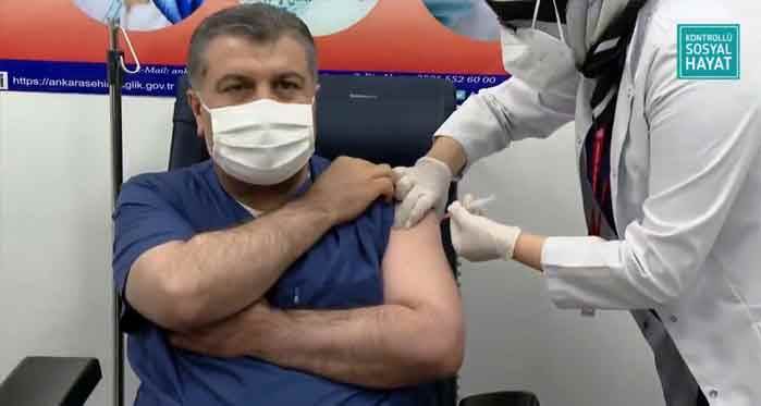 Türkiye İlaç ve Tıbbi Cihaz Kurumu, Coronavac aşısı için “acil kullanım onayı” verdi. Onayın çıkmasının ardından Sağlık Bakanı Fahrettin Koca ve Bilim Kurulu üyeleri kameraların önünde ilk aşıyı oldular.