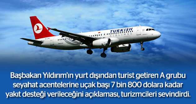Başbakan Binali Yıldırım'ın 2017 yılı boyunca yurt dışından turist getiren A grubu seyahat acentelerine uçak başı 6 bin dolardan 7 bin 800 dolara kadar yakıt desteği verileceğini açıklaması, turizmcileri sevindirdi.