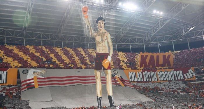 Mayıs 2017'de Bursa'da açılan "Siz diz çöktüğünüz için onlar büyük görünüyor, ayağa kalk" pankartından yola çıkarak hazırlanan, sayısız ödül almış "Rocky" filminin temasının işlendiği görsel şölen zavallıca çarpıtılmaya çalışılmaktadır. Aylardır Galatasaray tribünlerinde olan bir pankartın, kimsenin hayalinden geçemeyecek bir koreografiyle sunulmasını aşağılık terör örgütüne bağlayıp bu görsel muhteşemlikte bile o terör örgütünün reklamını yapan; koreografi bahane edilerek yine aşağılık terör örgütünün eli kanlı lideriyle Galatasaray ismini yan yana getirmeye çalışan hangi kurum, hangi kişi, hangi sosyal medya hesabı varsa her türlü hukuki hakkımızı kullanacağız ve bunun sonuna kadar takipçisi olacağız."