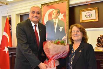 Misafirlerine ziyaretleri nedeni ile teşekkür eden Başkan Bakkalcıoğlu ziyaretin anısına çiçek takdiminde bulundu.