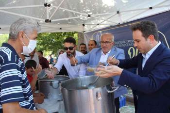 Milletvekili İshak Gazel, Belediye Başkanı Mustafa Güler ve AK Parti İlçe Başkanı Bilal Kıyak kazanların başına geçerek bir süre vatandaşlara aşure dağıttı.