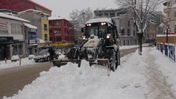 Bilecik’i etkisi altına kar hayatı olumsuz etkiliyor. Bilecik Belediyesi Fen İşleri Müdürlüğü ekipleri, kar yağışı nedeniyle vatandaşların herhangi bir mağduriyetle karşılaşmamaları amacıyla gece boyunca çalışmalarını sürdürdü. Kent merkezinde kepçe yardımı toplanan karlar, kamyonlarla şehir dışına taşınırken, kar nedeni ile vatandaşlar kaldırımlarda yürümekte zorluk geçti. Kış şartlarıyla mücadele kapsamında 7/24 saat esasına göre faaliyetlerini sürdüren belediye ekipleri, şehrin birçok ana ve ara arterdeki yollarda gece boyunca küreme ve tuzlama çalışması yaptı. Özellikle dar ve eğimli sokaklardaki çalışmaları gerçekleştiren ekiplerin çalışması ile vatandaşların herhangi bir olumsuzluk ile karşılaşması engellendi.