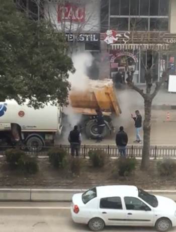Alınan bilgilere göre; merkez Atatürk Bulvarı üzerinde seyir halindeki bir kamyon sürücüsü, bankalar mevkiine geldiği esnada arka lastiğinden dumanların yükseldiği gördü. Hemen araçtan inen sürücü alevleri görünce koşarak yolun kenarındaki büfeye koştu. Bir kova su getiren sürücü alevlerin üzerine dökerken, sonra bir daha koşarak su almaya gitti. Bu esnada Bilecik Belediyesine ait su tankeri şans eseri durarak, alevlere müdahale ederek, söndürdü. Bu anlar bir vatandaş tarafından cep telefonuna an ve an kaydedildi.