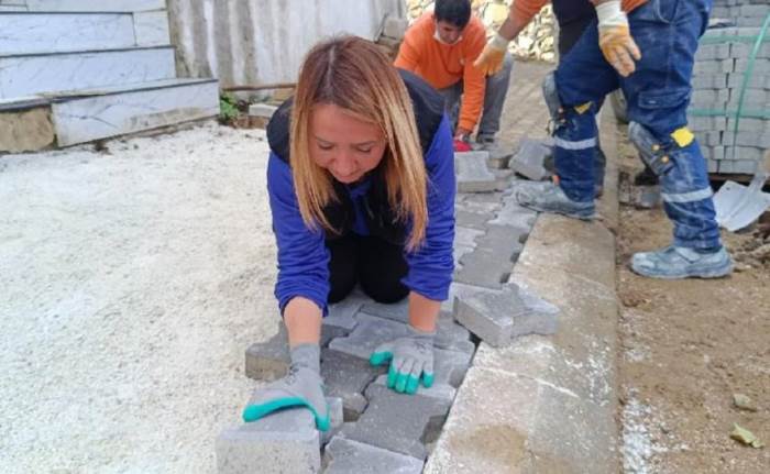 Bilecik'in Pazaryeri ilçesinde Belediye Başkanı Zekiye Tekin, kendi elleriyle parke taşlarını döşeyerek sahada örnek oldu.