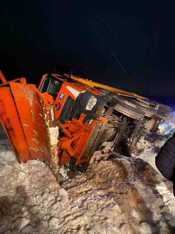 Bilecik’in Pazaryeri ilçesinde karayolunda kar kürüme ve tuzlama yapan kamyon devrildi.