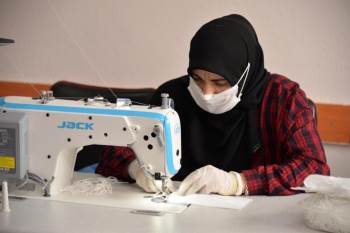 Bilecik Halk Eğitim Merkezinde Korona virüs (Covit-19) salgını ile mücadele kapsamında ’’eğitimden üretime’’ projesine destek veren kadınlar cerrahi maske üretiyor.