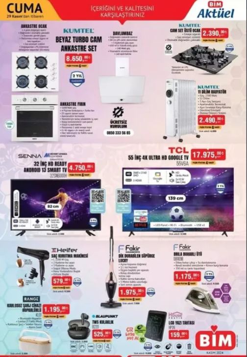 Bu hafta BİM aktüel kataloğunda elektronikten ev eşyalarına, kişisel bakımdan evcil hayvan ürünlerine kadar geniş bir yelpazede indirimli ürünler bulunuyor. Koşu bandı, ankastre set, davlumbaz, saç kurutma makinesi, kulaklık, termos ve daha pek çok ihtiyaç malzemesi mağazalarda uygun fiyatlara satışa sunuluyor. Ayrıca lastikli çarşaf, saklama kapları, temizlik seti gibi günlük kullanım ürünleri de müşterileri bekliyor. BİM aktüel ürünleri 26, 27 ve 29 Kasım tarihlerinde alışveriş severlerle buluşacak. Bu fırsatları kaçırmadan alışverişinizi gerçekleştirmenizi tavsiye ediyoruz.
